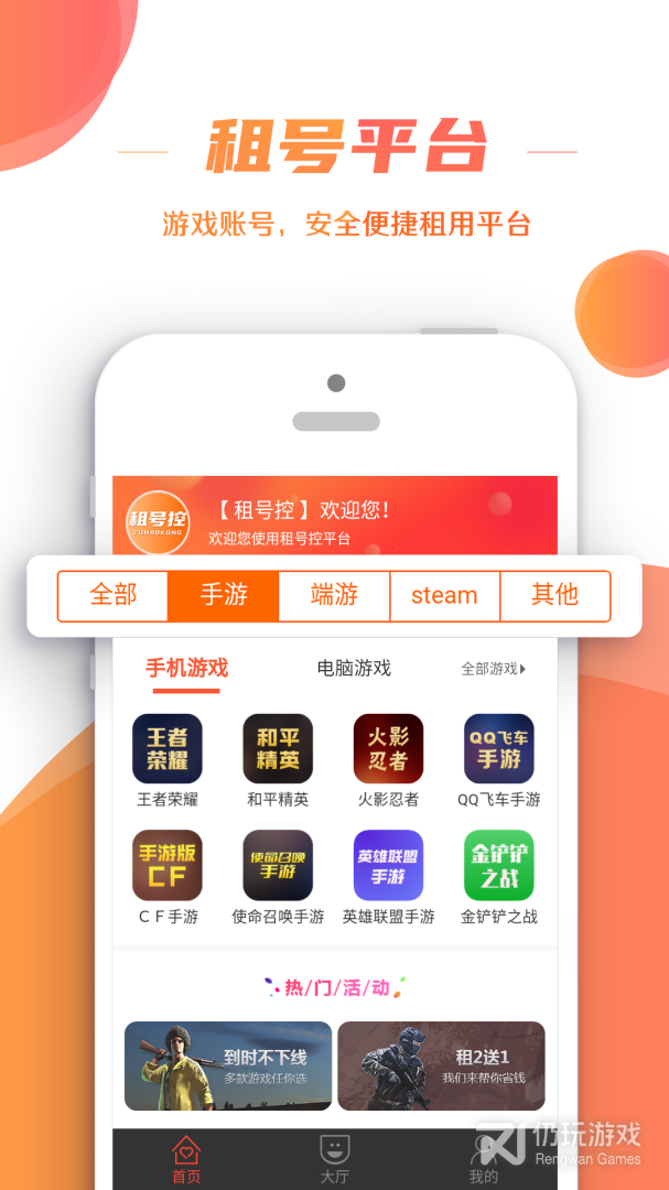 1、租号控各类不同的游戏帐号都是可以在平台内进行租赁的哦,同时还能畅玩体验到很多新款的游戏呢,在平台内你可以轻松的认识到大神玩家用户,不同级别的帐号都是可以租的,花低价即可,很多代玩的乐趣可以体验,帐号由用户自己随意性的选择