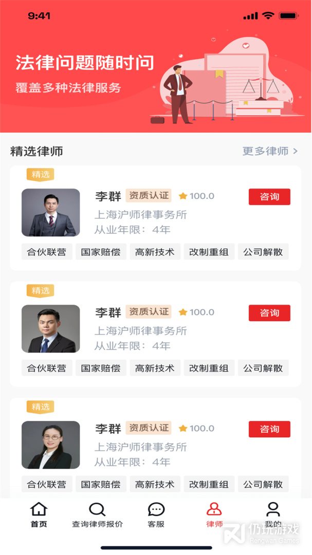 3、金牌服务一键@大牌律师,婚姻问题、劳动争议、合同纠纷、股权纠纷、交通问题等各类问题,线上or线下,多重选择,大牌律师零距离,助您摆脱法律问题困扰