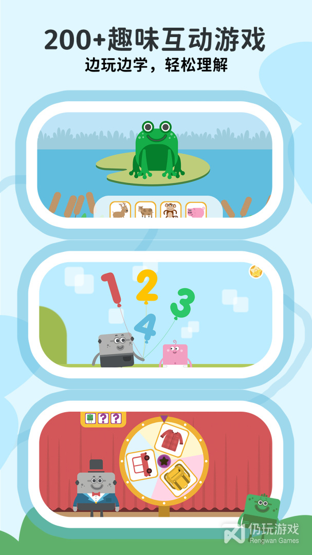 - 只有10分钟: 我们每天只会开启一节新的时长10分钟的英语游戏课程,避免孩子长时间在屏幕前。