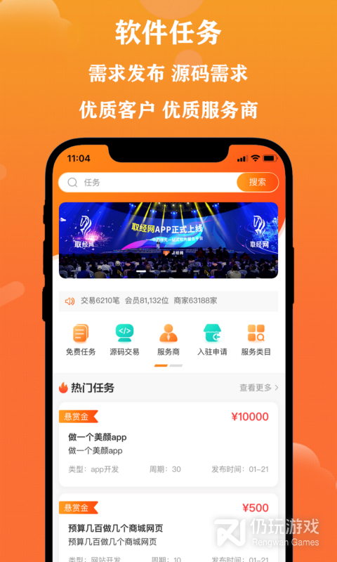 中国领先的一站式软件服务交易平台,服务交易品类涵盖软件开发、APP定制开发、游戏APP开发、小程序、公众号、网站建设、设计品类、工业物联网、其他互联网软件服务等多种类型,截至目前拥有近5000万的注册用户,源码品类,任务需求、服务商、普通需求用户还在不断增长,您的需求应有尽有,尽在取经网APP!