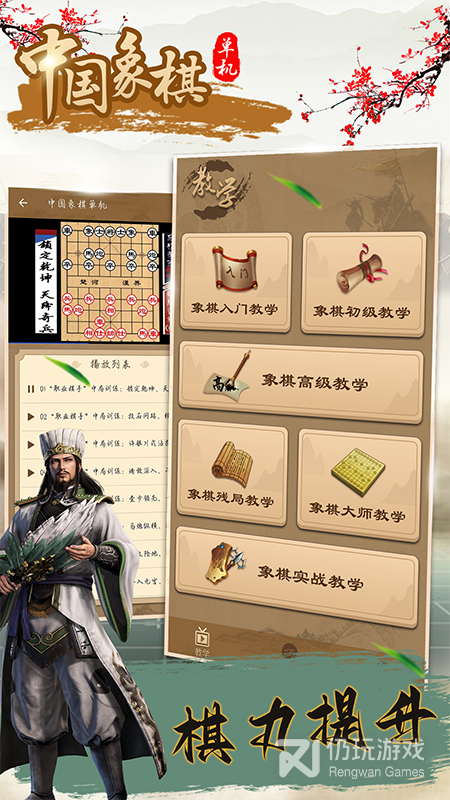 棋盘上有十条横线、九条竖线共分成90个交叉点象棋的棋子共有32个,每种颜色16个棋子。双方将轮流行棋,先把对方的帅“将死”的一方就能获胜。游戏还支持摆设棋局的功能,还有查看棋谱、电脑提示、悔棋、让子设置等更多功能。