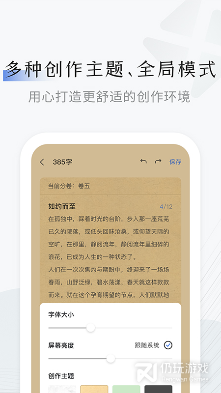 1、自定义设置创作主题,还能调节屏幕亮度,字体大小等
