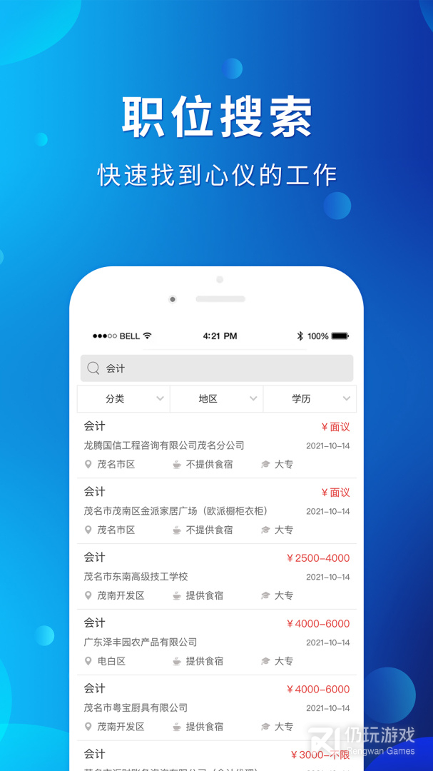 2、茂名招聘网是专为茂名本地市民而打造的当地求职招聘平台,让当地居民都可以找到满意的工作。软件中汇集了茂名当地所有的企业公司单位,而且大家可以根据自身的要求来筛选工作,可以和人事直接在平台上沟通,更是支持大家线上视频面试哦,帮助用户们快速找到工作