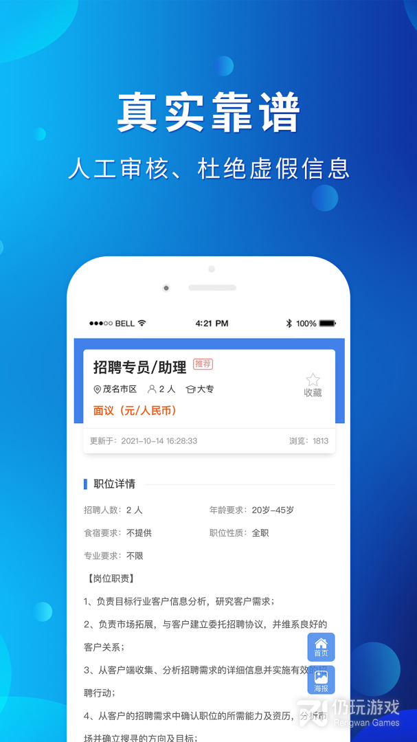 1、用户在这款茂名招聘网里面都是可以在这款软件里面找到自己想要的人或是工作的,海量的职位等你来选择,并且里面的一些企业都是经过实名认证的,您可以放心的来投递