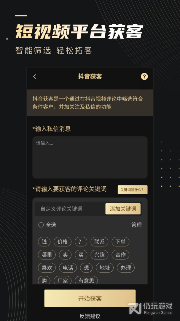 2、优化获客功能:内含小HS、抖Y、快S获客,通过自定义关键词搜索,智能筛选,快捷获取客户信息,同时发送自定义消息,打破传统获客模式,解放双手轻松拓客