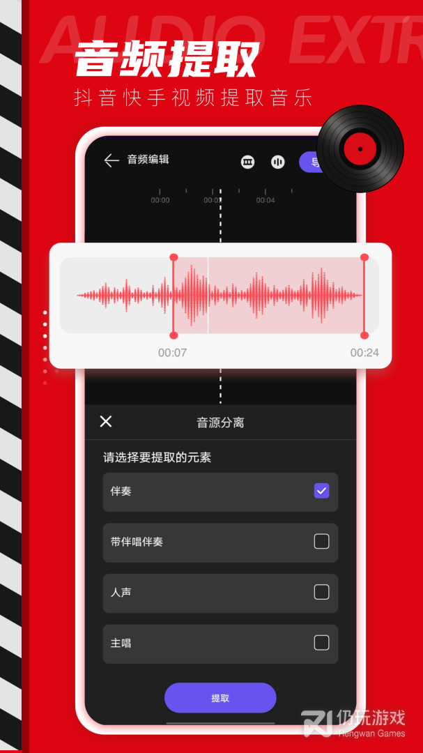 1、音频声音提取是一个专业的音频和音乐编辑器。有了音乐音频编辑,你可以编辑和录制音乐,声音和其他音频