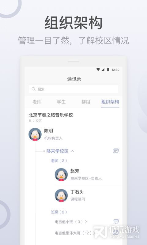 2、用户加入组织,可以查询校区排课情况,了解组织结构,并创建班级群聊,在线批改作业,加强师生之间的沟通联系,帮助用户轻松的进行各种教育管理,提高教学效率和课堂质量