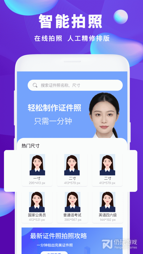 3、主要就是以拍证件照为主,你可以直接将普通的照片一键p图,制作专业的证件照,各种尺寸都有,计算机二级考试、英语四六级考试、教师资格证等800多种证书,都可以直接制作。除此之外,这里还有强大的美图功能,几十种滤镜任你选择,让你在家就能拍出符合心意的证件照