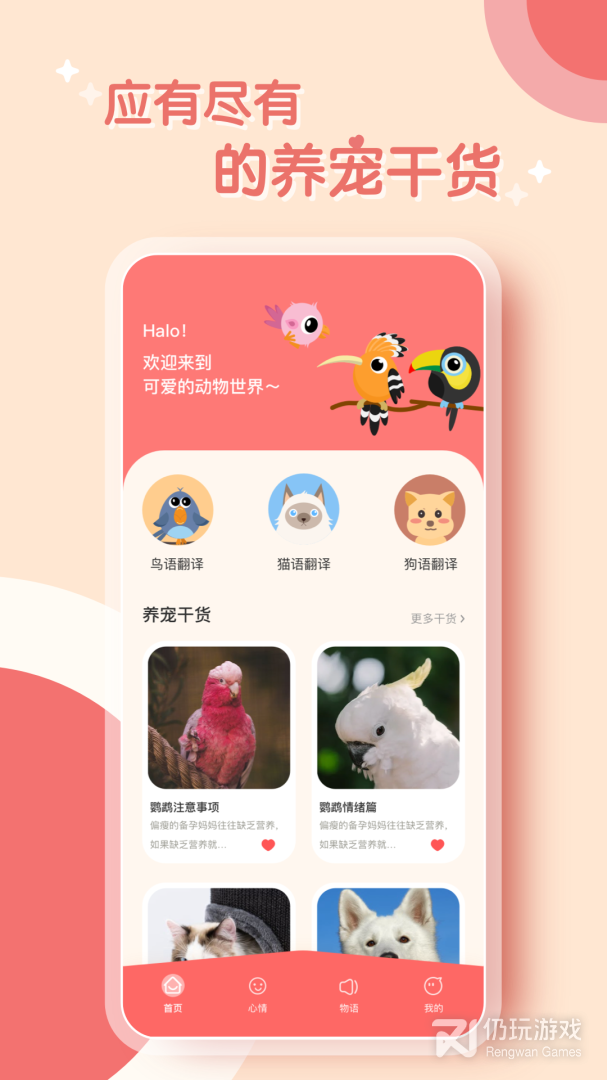 鹦鹉翻译器是一款专业的宠物交流翻译工具,操作方法简单,适合养宠物的伙伴使用。该软件目前支持鸟语、猫语、狗语翻译,随时了解宠物想法,除此之外,还有各种干货内容了解,更好养宠物,即可安装使用哦!