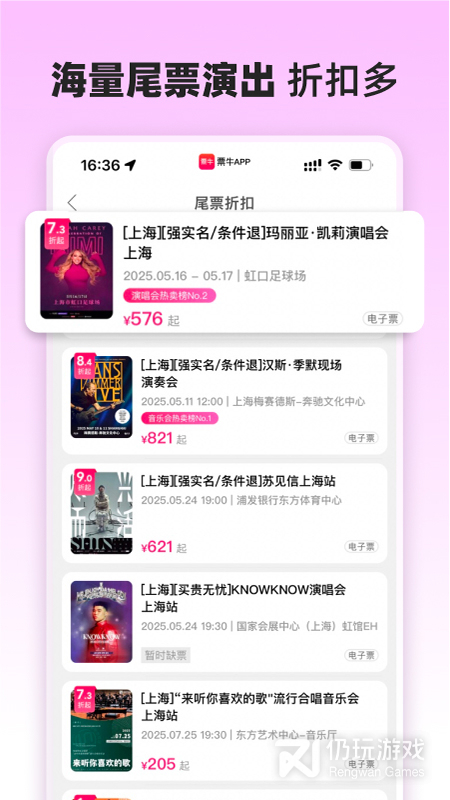 当下热门的演出经常一票难求,而票牛网拥有强大的票务资源,保证了用户热销票的需求。对于市场上一些热门演出及演唱会门票紧缺的问题,很多网站在预售期就以售罄,而票牛就是为用户解决一票难求,持续性售卖真实二手票资源的交易网站,使得整个市场保持长期票源稳定,为用户提供价值!