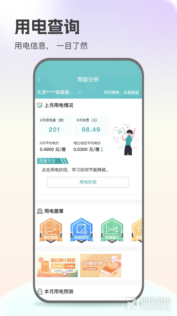 2、电费及电费:显示近3年(部分地区不到3年)用户总用电量及明细,方便用户及时全面了解、的用电量