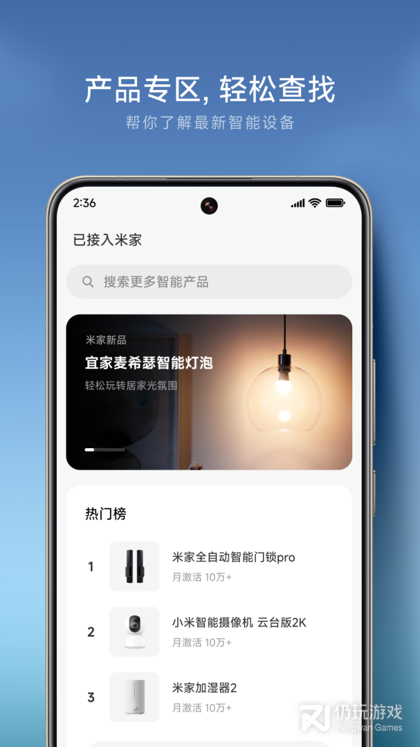 1、米家是一款专业的智能家居管理软件,只需要WIFI连接,就可以控制小米旗下一系列的智能硬件,比如开机、关机、定时运行等,超级的便捷实用,一款APP就能让万物互联,让用户更好地享受智能生活,感兴趣的朋友快来下载体验吧
