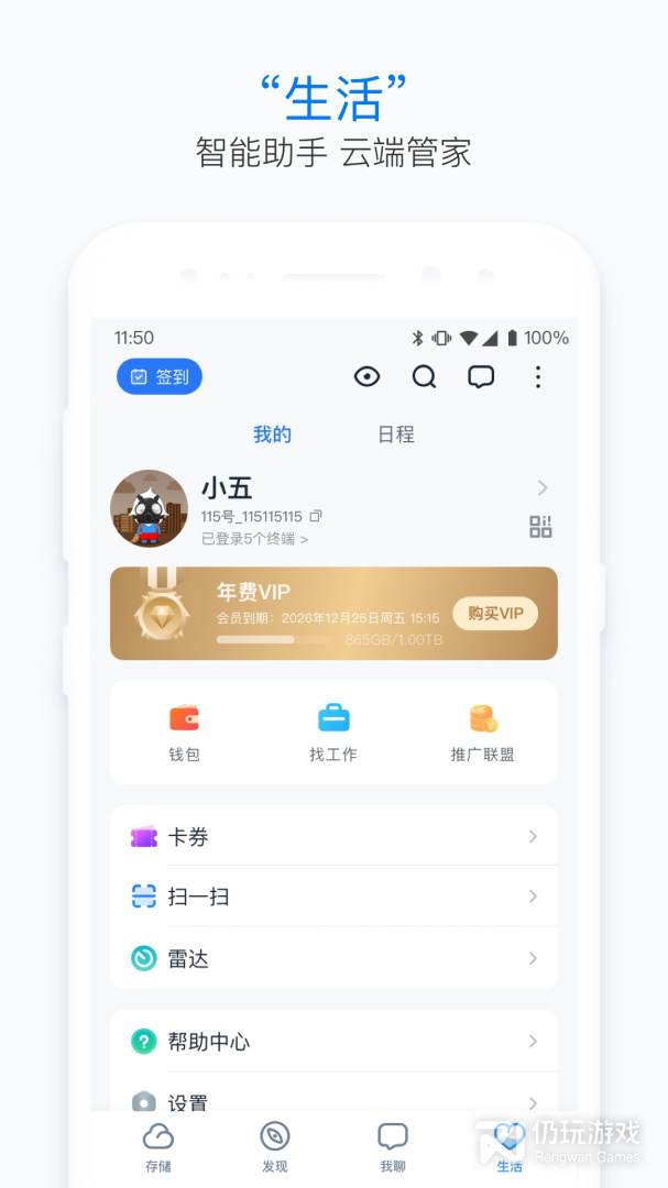 115——提供安全稳定、高效智能的云存储服务,支持相册、通讯录一键备份,海量空间轻松存储一生数据,并可直接在手机端远程管理各终端的设备登录情况,安心又省心。