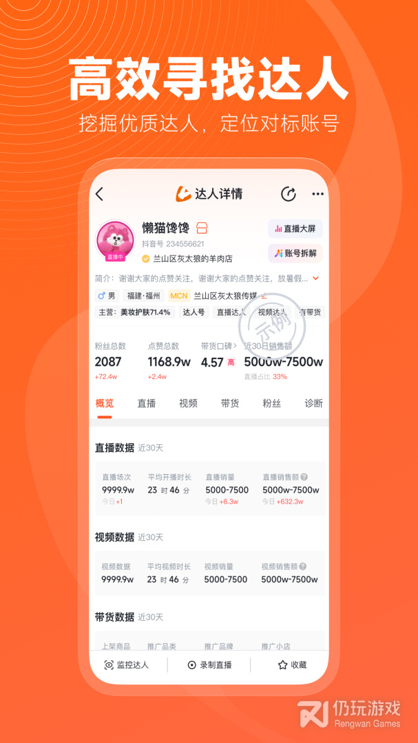 -分析各行业数据流量趋势,定位账号内容,发掘优质直播带货达人主播。