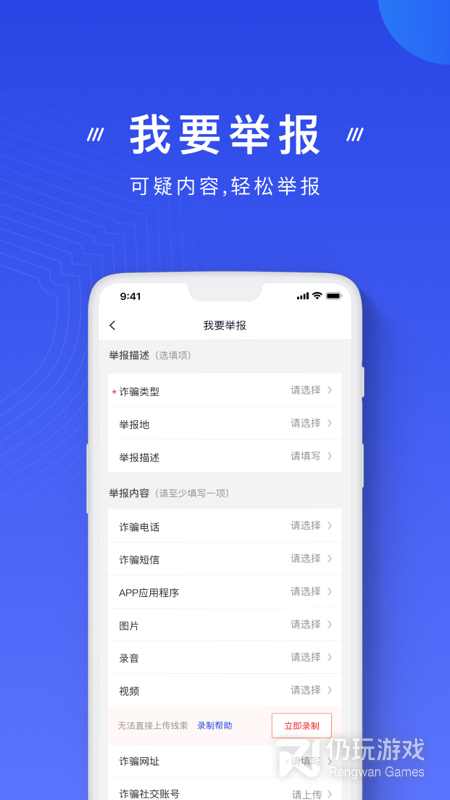 第一个功能是“我要举报”功能:对违规的平台、软件进行举报;