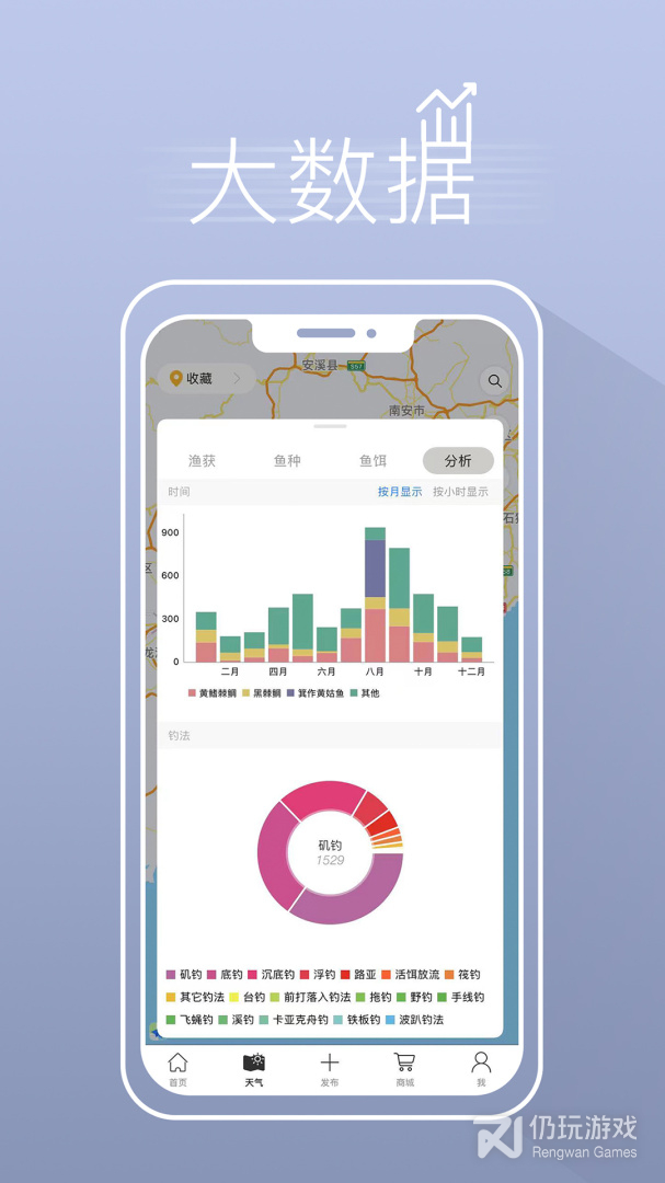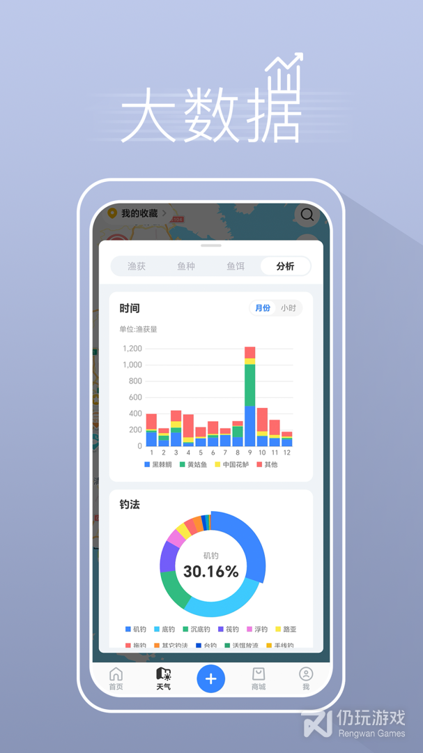 鱼情分析: 基于海量真实捕获数据以及渔获强大的全球天气预测数据,提供个人、钓场、地区、鱼种等多维度鱼情大数据分析。