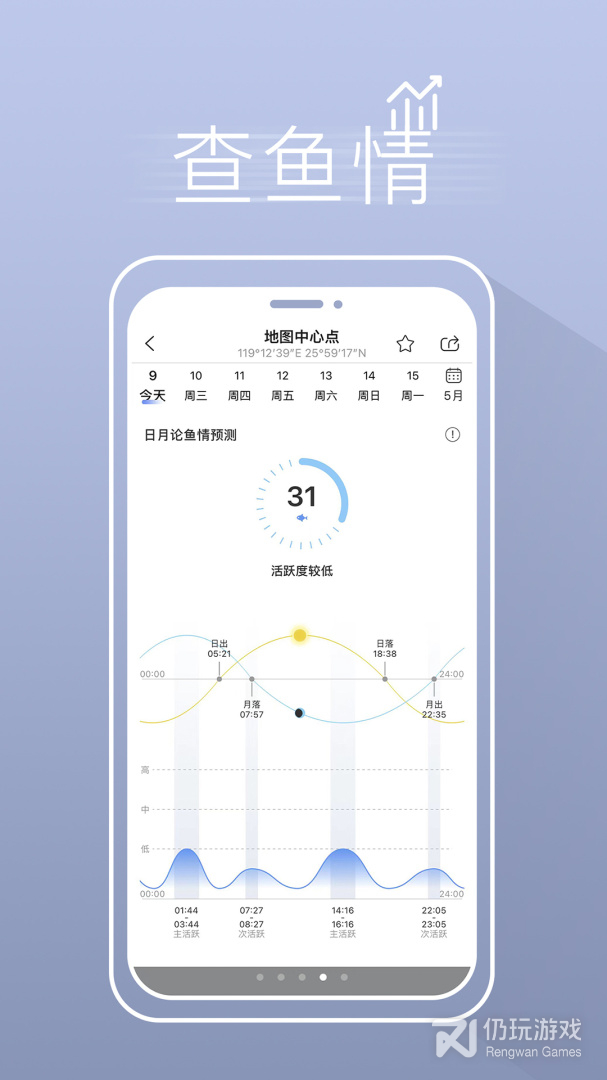 看天气:支持一周内天气查询和海况预报,直观并详尽地展示一天之内每隔1个小时的天气状况,包括温湿度、气压、降水量、风向、风力、浪高等内容。根据季节、日照时间、潮汐情况以及月相共同作用得出鱼类活动趋势,为用户的出行计划提供参考。
