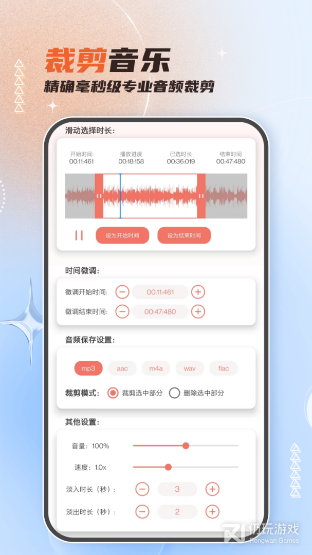 音频剪辑:可以对各类型的音频剪切制作,提取你中意的音频;