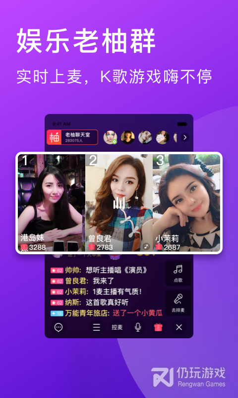 ktv式的直播氛围,百万首老歌重温经典。缤纷礼物,实时互动。拿起手机,开启直播。在老柚你就是大明星。