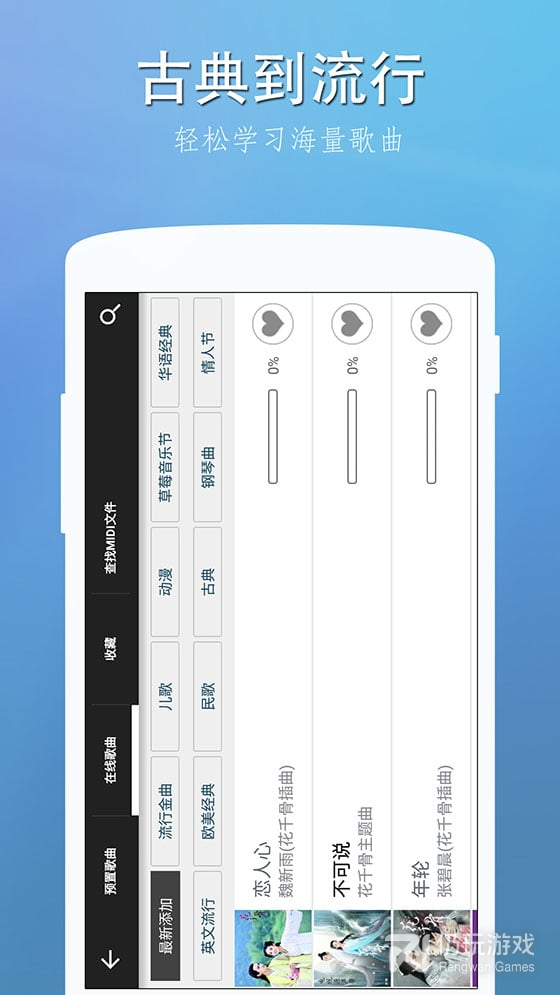 2、《完美钢琴》是一款免费的手机钢琴模拟应用,通过这款软件你可以在手机上感受弹奏钢琴的体验。完美钢琴内置了大量的学习歌曲,你可以按照系统给你的音符来弹出完整的歌曲,就算是不懂五线谱的用户也能轻松玩转。这款软件还能调节弹奏的音调,你还能跟友人一起比赛弹奏曲目