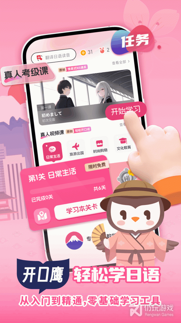 专为零基础学员打造的的日语学习任务系统,是你随身的日语老师,知识讲解、单词背诵、练习测试、总结复习,带着你一步一个脚印的学好日语。