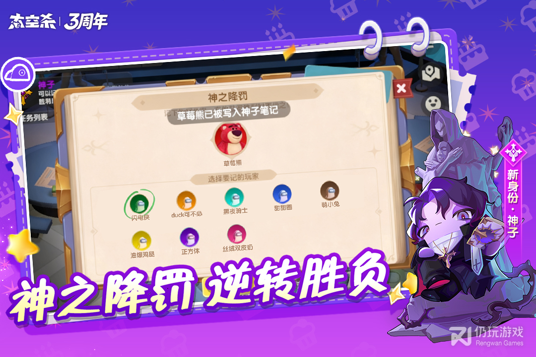 12月5日起,登录送夺宝22连抽、海量金星和限定身份皮肤!新身份神子整顿太空杀,体验全史诗身份皮肤畅玩,送新身份和糖豆体型皮肤!还有3周年限定铭牌、永久身份自选卡和豪华回归奖励等你来拿!