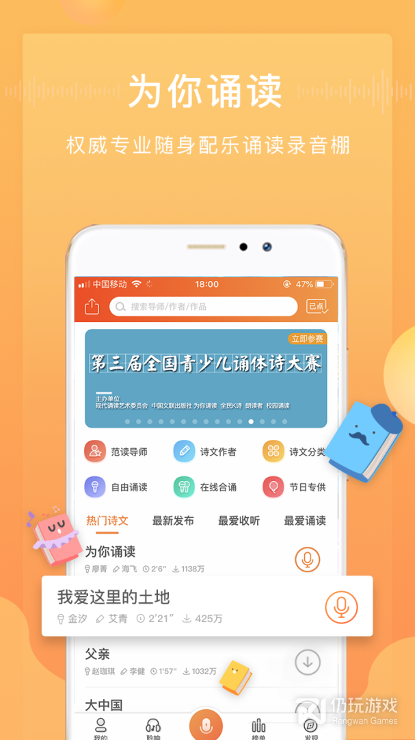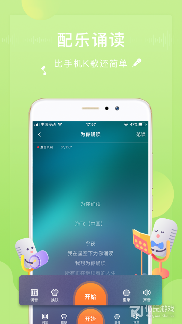 为你诵读不仅是全球、随身携带、还会上瘾的“手机K歌模式”的配乐诵读录音软件!更是颜值高、人气旺、有内涵的诵读类交友神器!