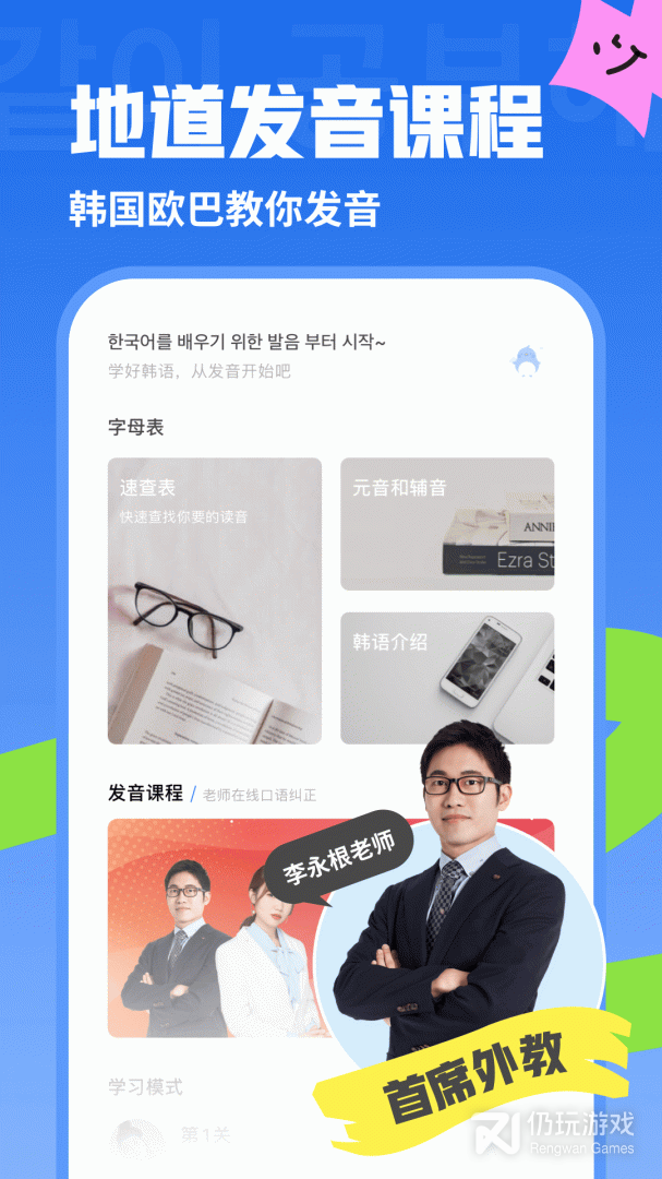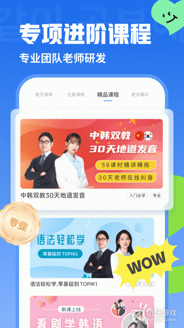 精编吃吃喝喝、人际交往等专题课程,更有热门综艺《RunningMan》、《拜托了冰箱》……经典韩剧《来自星星的你》、《请回答1988》……从词、句到对话学习,循序渐进,闯关形式使学习更有动力。