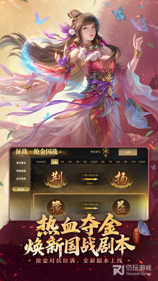 以国家为单位进行征战,通过国战争夺虎符,使用虎符宣战阵眼争夺战,镇守【囚龙八仙阵】之阵眼,赛季根据阵眼和虎符数量进行排名结算,如果占领全部八个阵眼,更可达成一统天下!此外每个阵眼可以开启每周国家副本,进入挑战BOSS获得豪华奖励。