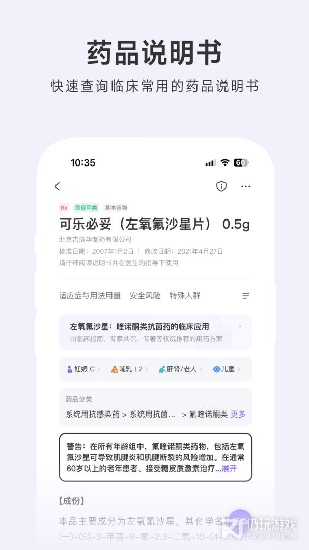 ·药品信息:超 50000 份国内外上市药品说明书免费查阅,以及 1500+ 药物成分(ATC 分类)的合理用药指导,包括用法用量(含国内外用法用量对比)、安全用药(含特殊人群用药调整、妊娠哺乳用药安全、药物警戒等)、药理毒理、患者教育等受医生关注的用药疑问