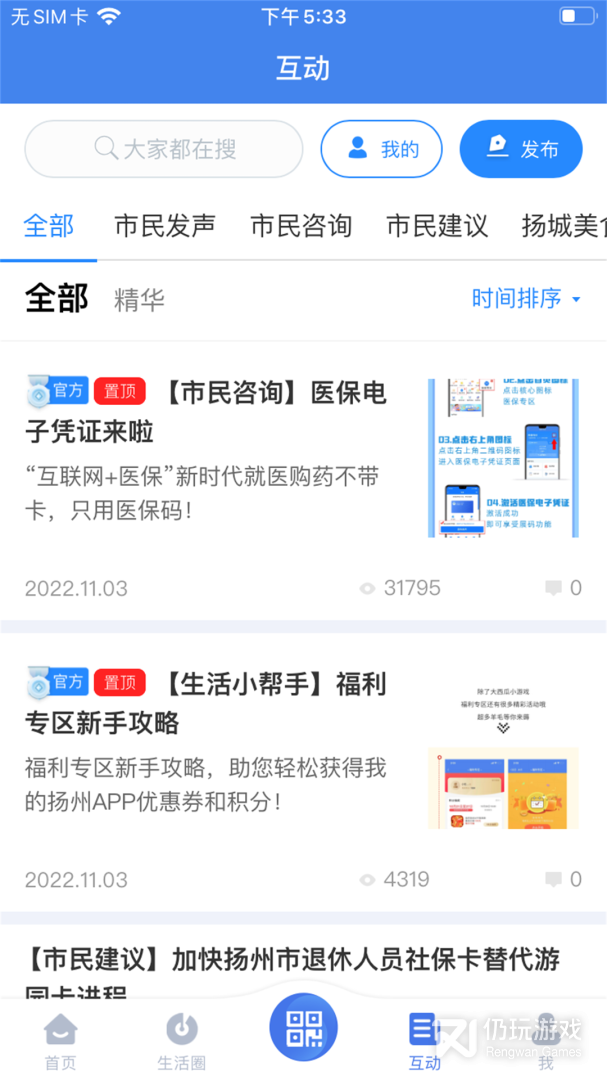 4、在互动功能中我们用户民众可以在这里给政府题建议,还有扬州的旅游美食等新闻都可以在这看到;