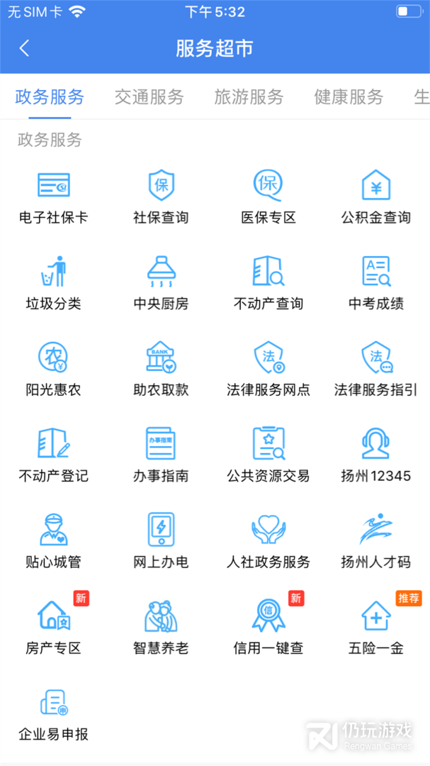 3、服务超市功能包括了政务服务,交通服务,旅游服务,健康服务等功能;