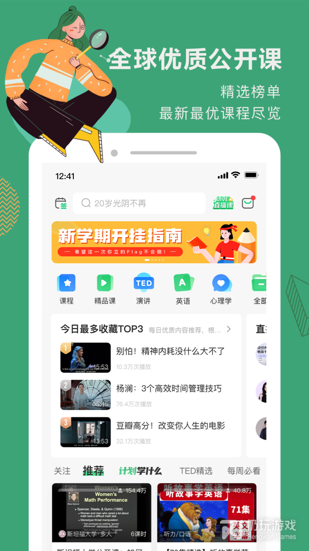 课程多,更新快,能缓存,无广告,网易真的是良心企业。建议可以开发音频播放模式,有时候保持屏幕打开反而是种累赘。另一个推荐的功能是关于字幕翻译/课程内容的讨论研究小组,使用者能够组成话题社区,有更多的互动交流,像网易云音乐学院评论一样,成为凝聚用户的力量。