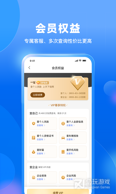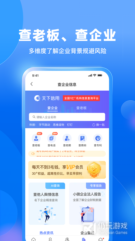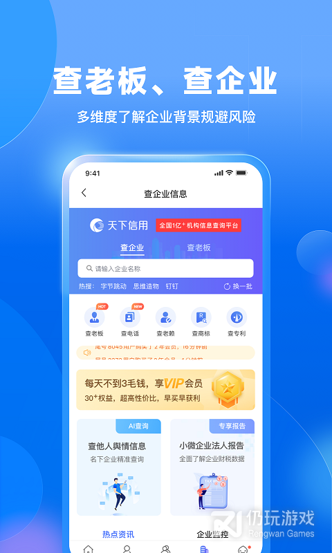 天下信用是非常全面的信息查询平台,覆盖了全国所有地区的企业和个人。用户可以在这里实时查询自己的个人征信情况,了解自己的详细数据。用户还可以在这里查询企业的征信报告、投资关系、股权结构、知识产权等等。