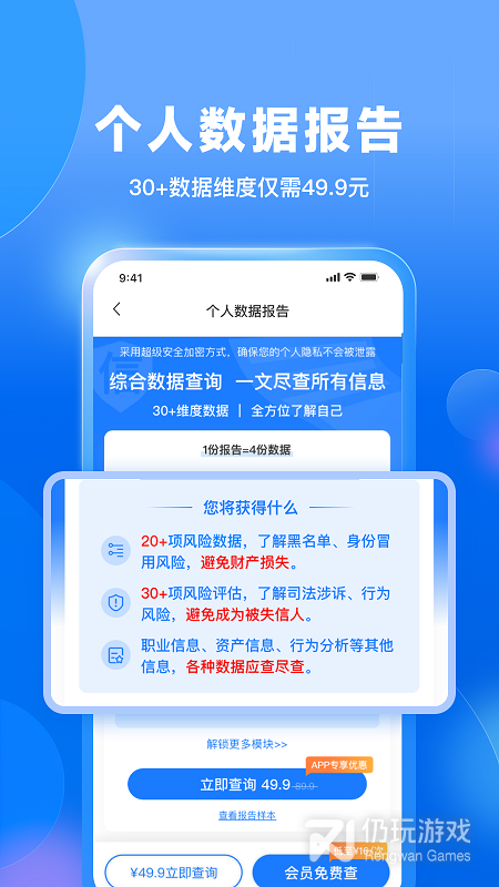 个人风险报告:行为分析、消费申请通过率、失信信息、羊毛党名单等;为用户个人检测失信风险,检测信息安全等。