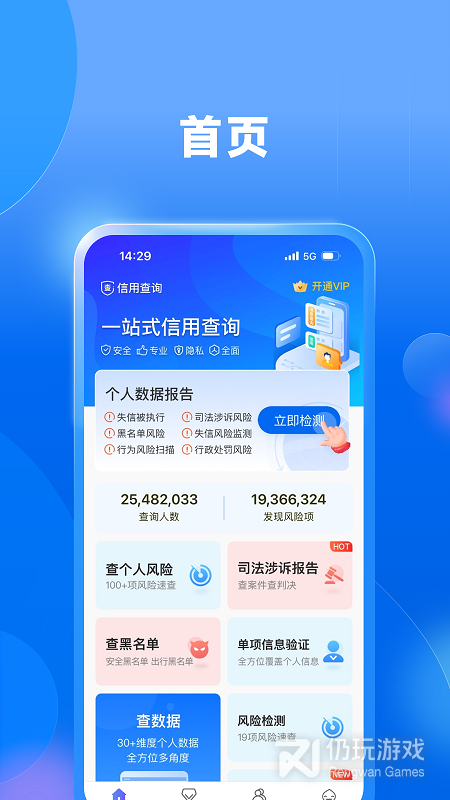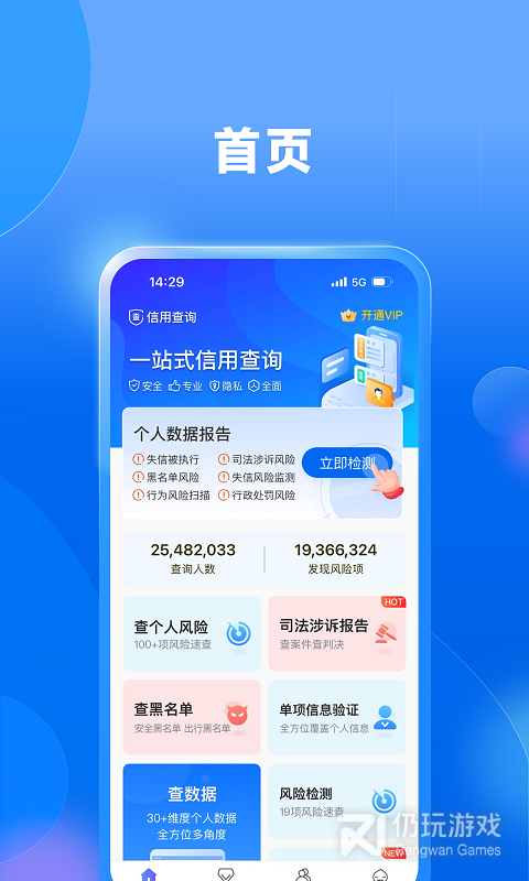 1、打开信用查询app,首页如下图所示,包含了全面监测报告、风险监测报告、免费领取保障等功能;