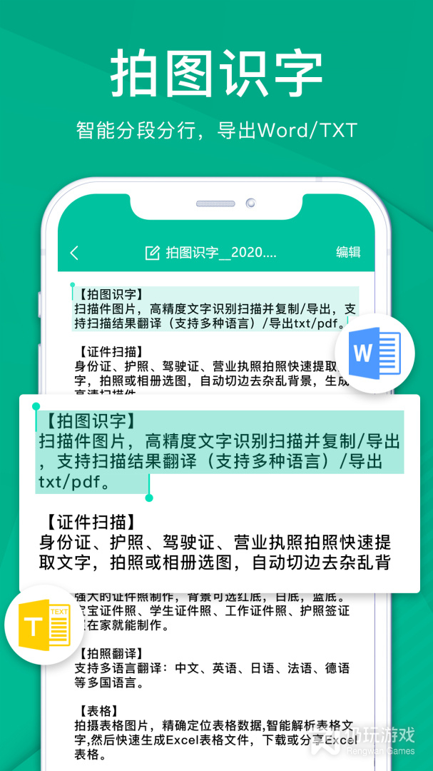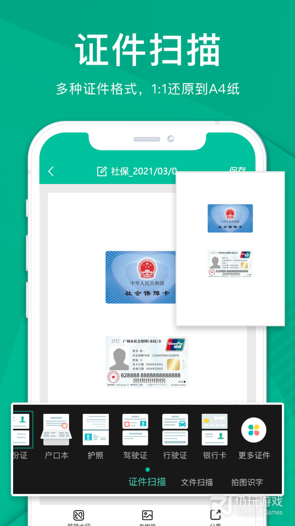 身份证、护照、驾驶证、营业执照拍照快速提取文字,拍照或相册选图,自动切边去杂乱背景,生成高清扫描件。