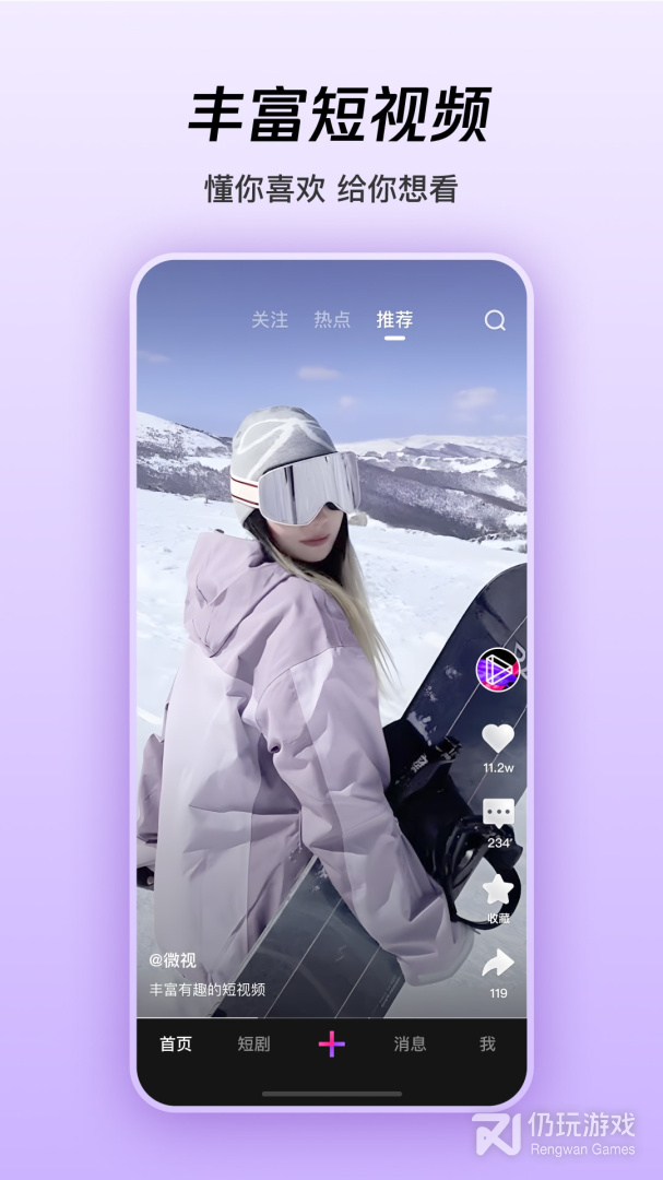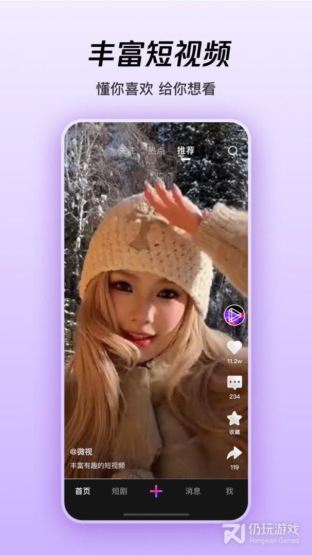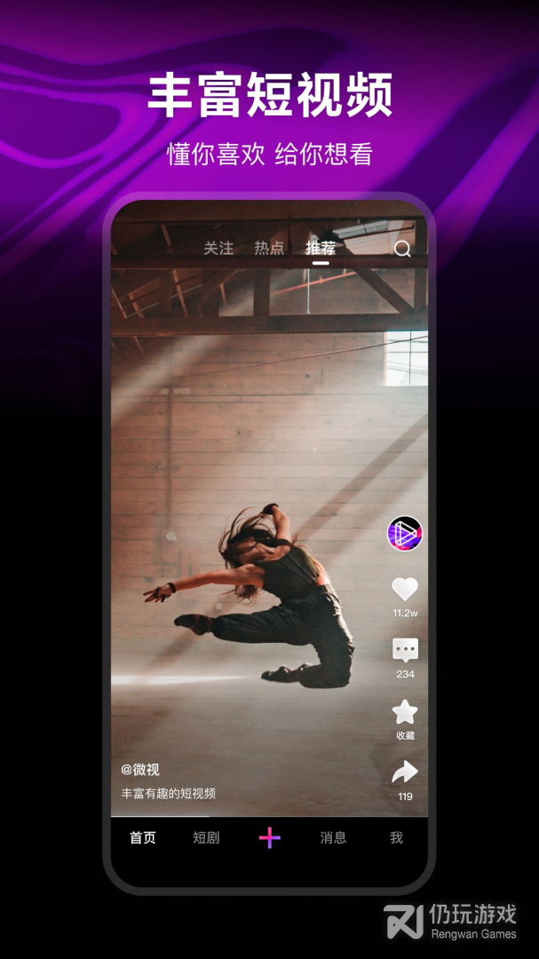 微视是由腾讯出品的融合众多优质功能的短视频互动社区。你可以在这里欣赏到众多好玩有趣的短视频,也可以通过软件来自己制作各种热门短视频。你还可以在这里观看海量的经典影视剧,欣赏精彩纷呈的直播表演,让你一整天都可以享受到不同的乐趣。
