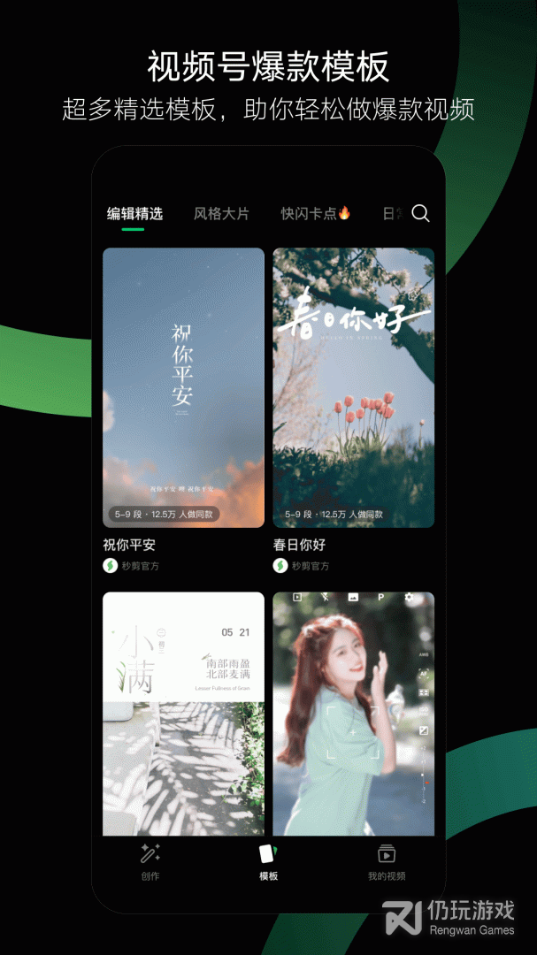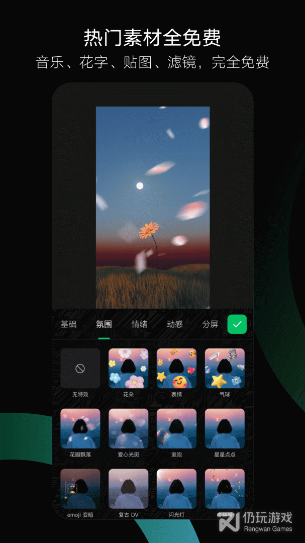 · 精心设计样式:「滤镜」「转场」「特效」「花字」「贴图」「字幕」等样样都有,样样精心设计,并由专业剪辑师自动帮你配好。