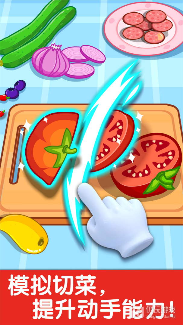 ++切菜:宝宝手指点点滑动屏幕,就像画画互动一样,少儿专注地处理奇妙美食,爱上吃饭。(认知水果蔬菜和肉类)