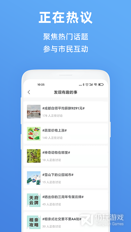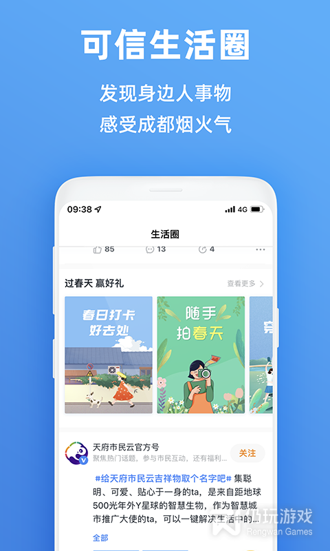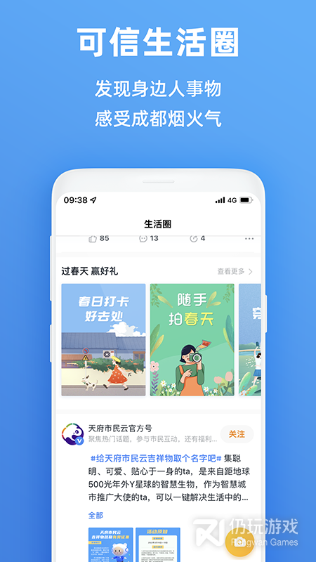 天府市民云是由成都市官方推出的一站式城市服务平台,成都市的居民可以在这里加入各自所在的社区,及时的了解发生在自己身边的事情。用户只需要一个账号就可以办理各种政府部门的业务,不需要你再不断的进行奔波,省时又省心。