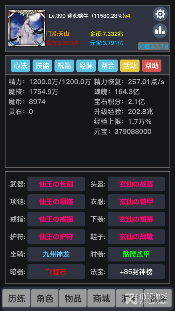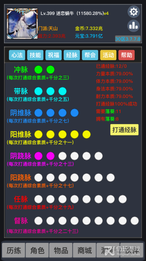 6、 300级之后只能使用等级丹升级,等级上限为2400级,上线后直接前往初级、中級打宝地图,一边打怪还能一边泡点直接达到300级。