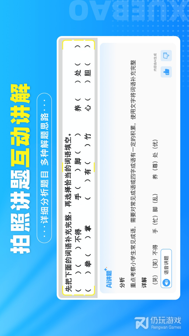 学宝是专为中小学生打造的陪伴式学习辅助应用。软件完全同步孩子们的学习进度,就算在课堂上没有完全的理解,也可以在家里进行反复的学习,保证每一个孩子都可以完全吃透教材上的内容。