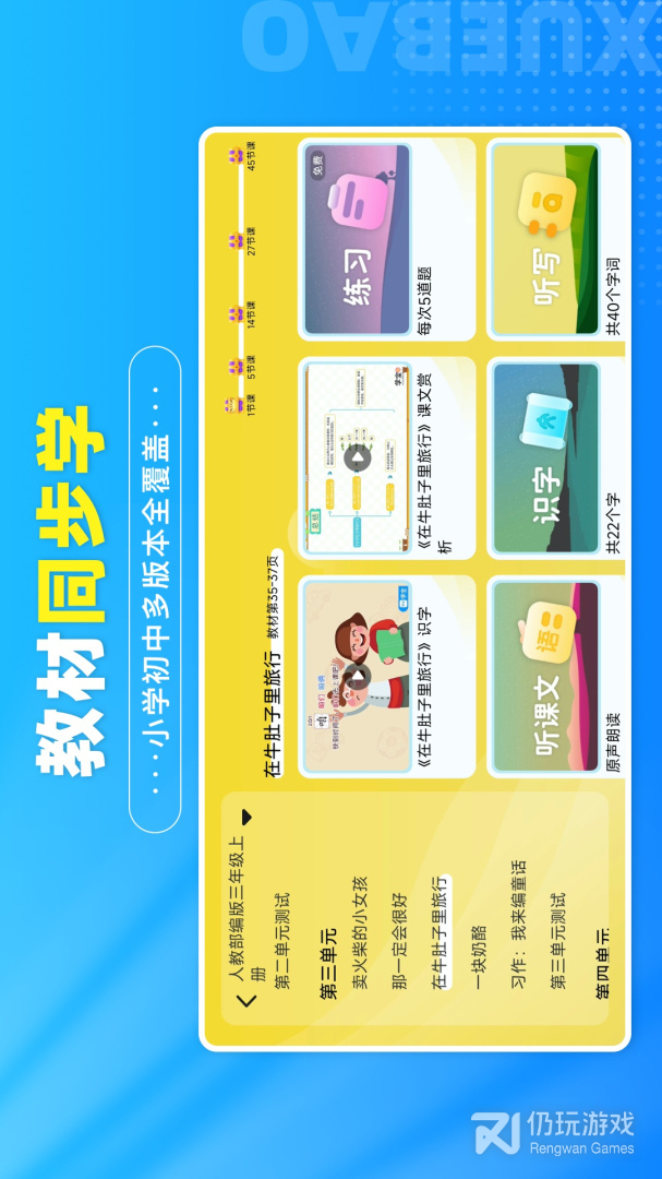 学宝是中小学语文、数学、英语全科同步学习智能教辅APP,动画视频内容与全国主要教材相配套。