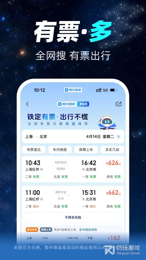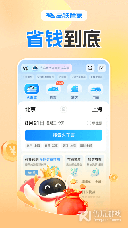高铁管家,2亿出行用户的选择!随时随地购买火车票,支持学生票、儿童票、残军票,动车、高铁、特快、绿皮车买票、退票、改签不发愁,还能一站式预订机票、汽车票、专车、酒店。