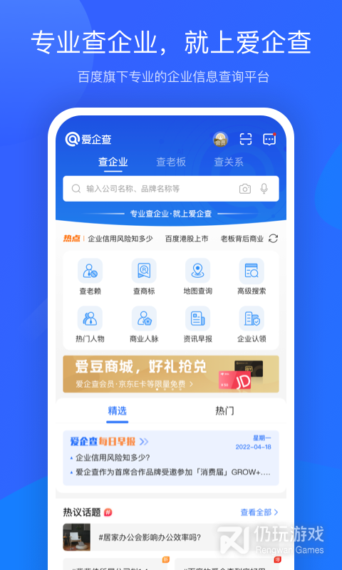 1、首先下载/安装/运行爱企查,然后就会看到如下图,有着查老板、查企业、查老赖、行业热点新闻等功能: