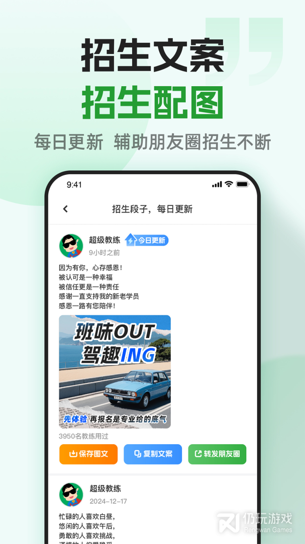 招生:每天更新招生文案配图,体系自动分配学员。招生不费力。