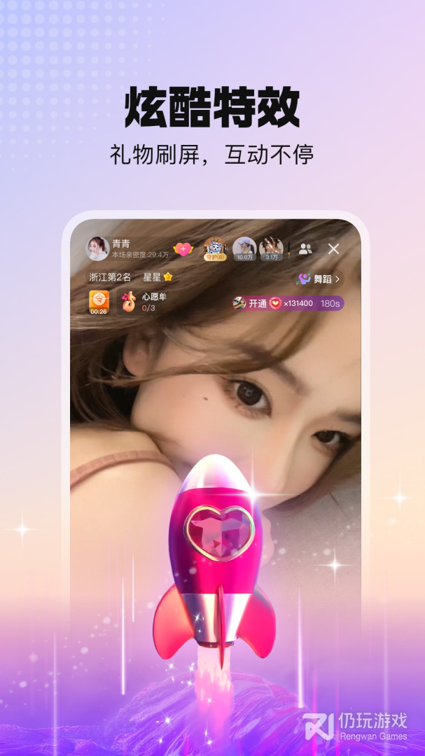 表达心意:弹幕聊天、虚拟礼物点击就送,酷炫效果立刻引起主播的注意。