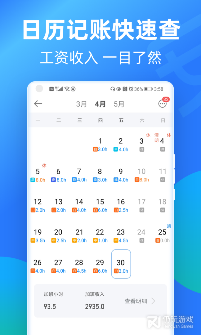安心记加班是对那些记不清自己加了多少班,或者是加了班却没有加班工资的人而推出的加班记录软件。你可以在这里设置自己上班的详细信息,早班、中班、晚班,加班还是休息都可以在这里清晰的呈现。为你详细计算每个月的具体工资,可以有效避免被工厂或者是公司套路。