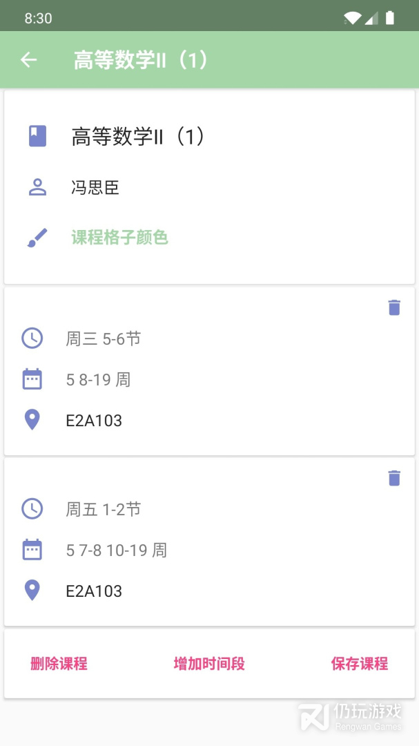 3、输入课程名字、周次、教师、教室,并可自定义课程格子的颜色;